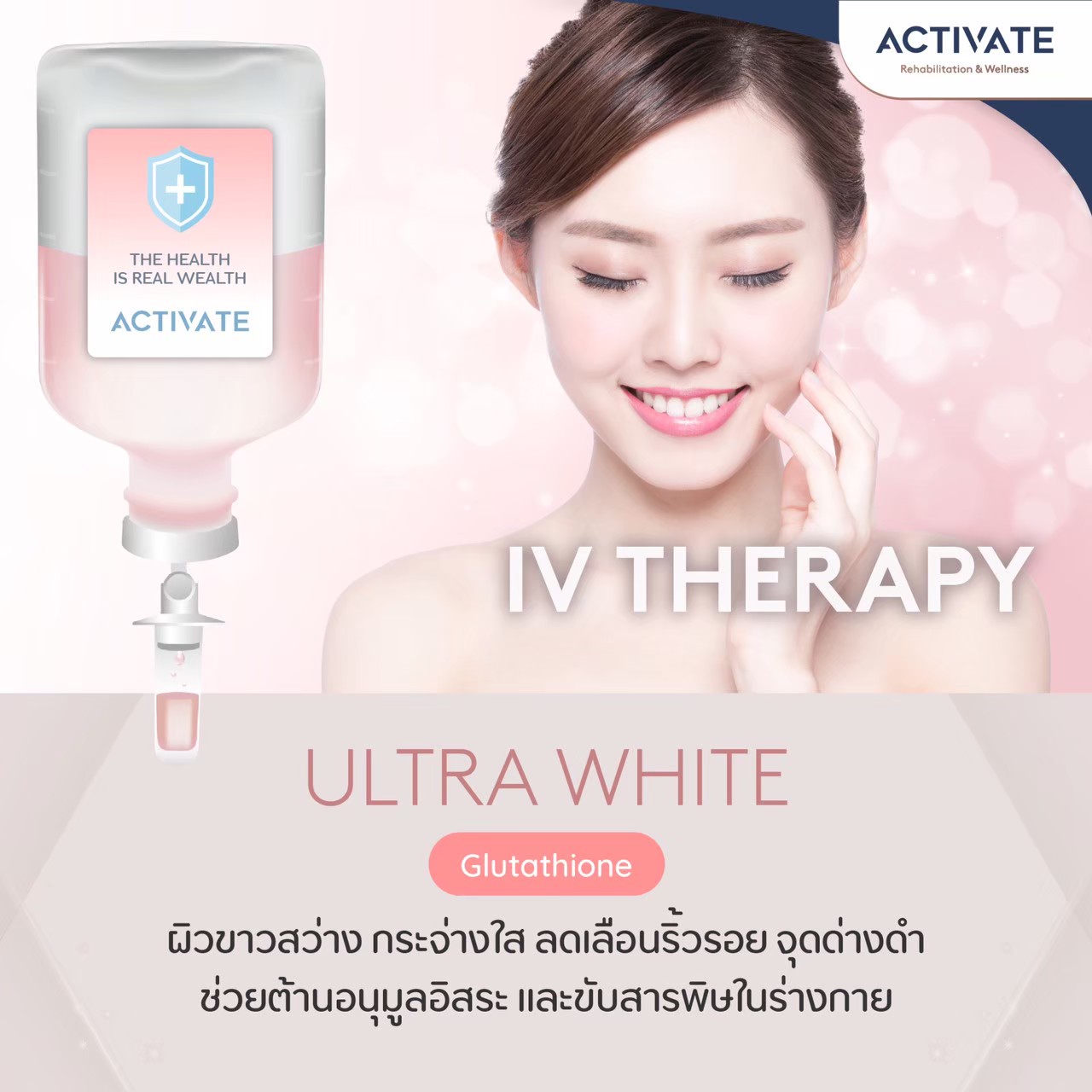 การให้สารอาหารทางหลอดเลือดดำ ประกอบไปด้วยส่วนผสมของสารสกัดจากธรรมชาติ ที่มีวิตามินรวม และแร่ธาตุเอนไซม์ที่ทรงประสิทธิภาพด้านการปรับสภาพสีผิวให้สว่างกระจ่างใส ดูมีออร่า พร้อมป้องกันเนื้อเยื่อไม่ให้ถูกทำลายจากอนุมูลอิสระที่สะสมอยู่ภายในร่างกาย ช่วยลดริ้วรอยจุดด่างดำ ปรับสีผิวให้เรียบเนียนสม่ำเสมอทั่วเรือนร่าง นอกจากนี้ยังมีคุณสมบัติด้านการกระตุ้นการผลัดเซลล์ผิวที่อยู่ชั้นนอก ช่วยให้เผยผิวใหม่ที่ดูสุขภาพดีได้เร็วยิ่งขึ้น